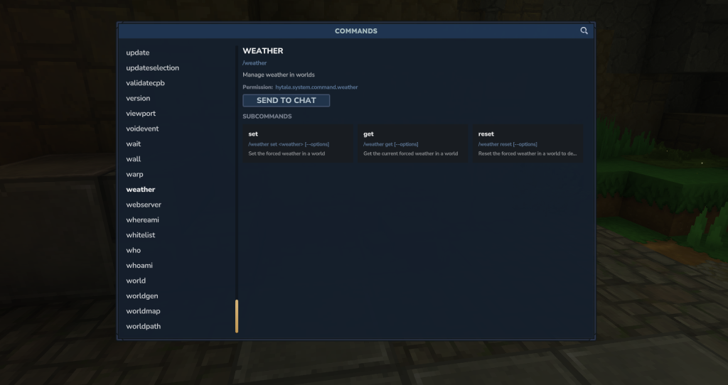 rain,clear,snow, etc.) sont des assets météo prédéfinis par le jeu. Hytale permet aux créateurs de contenu d’ajouter leurs propres types de météo via le système d’assets pour des expériences uniques. - Impact sur le gameplay : Utilisez la commande de contrôle météo pour créer des ambiances uniques pour vos constructions, des défis pour vos joueurs (une tempête de neige subite !), ou simplement pour profiter d’un soleil éternel.