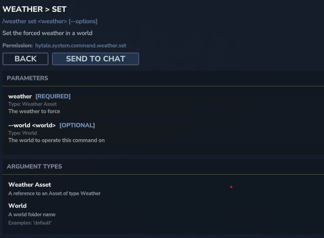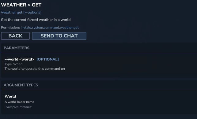 La permission de base pour le système de commandes météo est hytale.system.command.weather.
