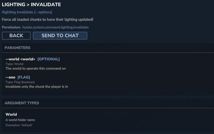 | Invalidate lighting | /lighting invalidate [--options] | Forces all loaded chunks to recalculate lighting, useful for fixing visual errors after modifications. | /lighting invalidate --world main |
