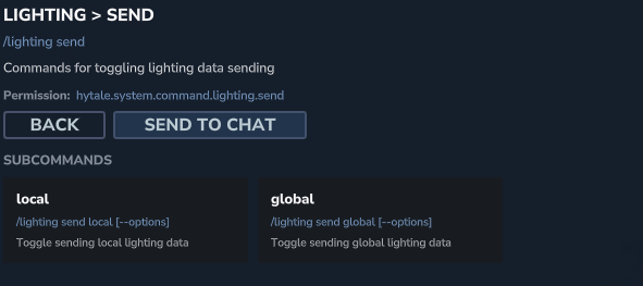 | Control data sending | /lighting send | Manages the sending of lighting data to clients. Can be used to disable sending light updates for network debugging. | /lighting send --disable |