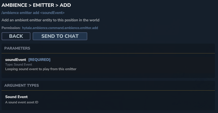 | Manage emitters | /ambience emitter | Accesses the management of ambient sound emitter objects. | /ambience emitter |