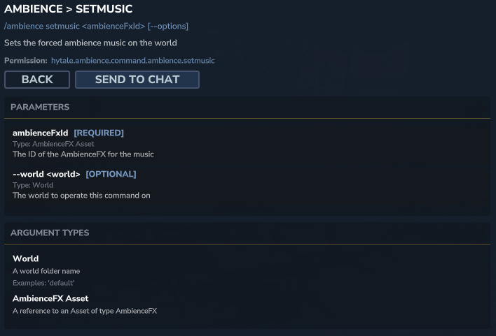 | Force music | /ambience setmusic <ambienceFxId> | Forces the playback of specific music by its identifier. | /ambience setmusic hytale:forest_theme |