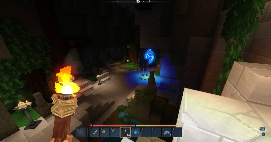 Conseil : Avant de partir, craftez un équipement de base en cuivre. Vous croiserez certainement des créatures hostiles en chemin, et l’entrée du temple est gardée.