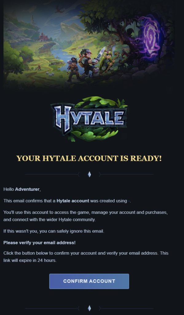 Vous recevrez un courriel intitulé « Your Hytale account is ready! ». Vous devez impérativement cliquer sur le bouton bleu « CONFIRM ACCOUNT » pour finaliser la création. Attention : ce lien de validation expire souvent sous 24h.