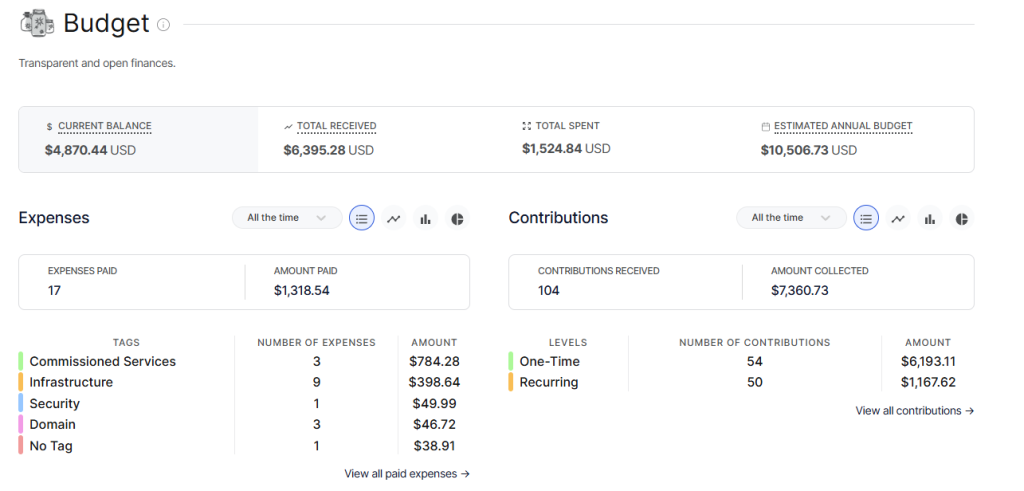 Ici, avec Open Collective, tu peux voir les contributions, les dépenses, les catégories de coûts, etc.