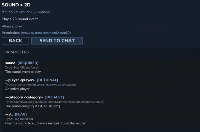 | Jouer un son 2D | /sound 2d <son> [--options] | Joue un événement sonore en 2D, audible par tous les joueurs, sans position spécifique, idéal pour les alertes ou la musique d’ambiance générale. | /sound 2d hytale:sfx_attn_loud |