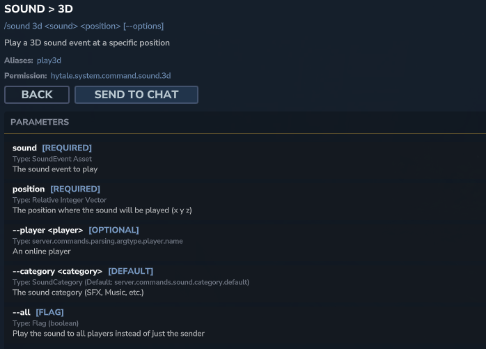 | Jouer un son 3D | /sound 3d <son> <position> [--options] | Joue un événement sonore en 3D à une position spécifiée dans le monde, offrant une immersion spatiale avec atténuation. | /sound 3d hytale:sfx_arrow_whistle ~ ~10 ~ |