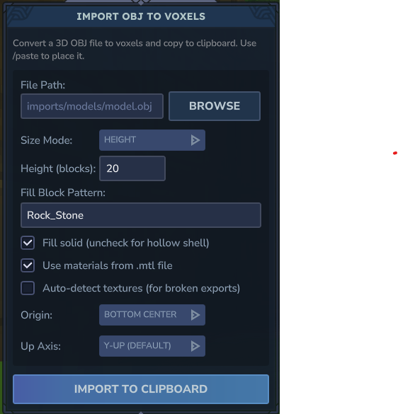 Convertit un fichier 3D .obj externe en voxels. Vous pouvez définir la taille en blocs (Height), choisir le matériau de remplissage (Fill Block Pattern, ex: Rock_Stone), et décider si l’objet doit être plein ou creux via la case Fill solid.