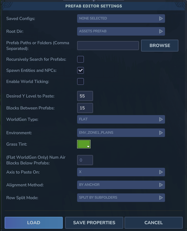 Un outil puissant pour configurer comment une structure est collée dans le monde. Vous pouvez régler le niveau de hauteur (Desired Y Level), l’espacement (Blocks Between Prefabs), et même le type de génération de terrain (WorldGen Type, ex: FLAT). Une case à cocher importante, Spawn Entities and NPCs, permet d’inclure les monstres associés à la structure directement à l’apparition.